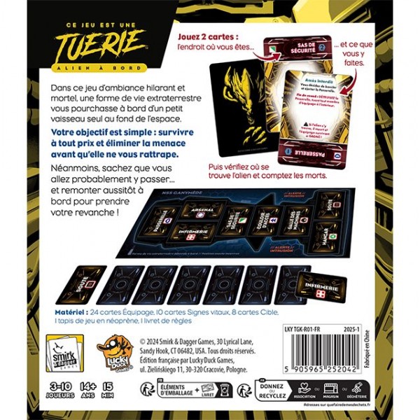 Dans Ce jeu est une Tuerie, jeu d’ambiance hilarant et mortel, une forme de vie extraterrestre vous pourchasse à bord d’un petit vaisseau-cargo seul au fond de l’espace. Votre objectif est simple : survivre et éliminer la menace avant qu’elle ne vous rattrape. Néanmoins, sachez que vous allez probablement y passer… et remonter aussitôt à bord pour prendre votre revanche ! Vous êtes prévenu : Ce jeu est une Tuerie !