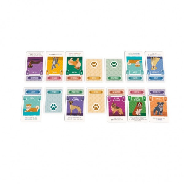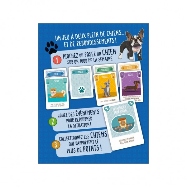 Disposez 7 cartes Jour devant vous pour constituer votre semaine. Le but du jeu est de cumuler le plus de points en posant un chien sur chacun de ces jours. À votre tour, piochez une carte ou posez un chien sur un jour libre de votre semaine : certains ne peuvent être joués que sur des jours précis, ou adjacents à un congénère spécifique. D'autres permettent de recouvrir une carte, ou de l'envoyer chez votre adversaire. Enfin, vous pourrez tirer profit des cartes Événement pour déplacer, défausser ou échanger des chiens, et retourner ainsi la situation à votre avantage ! Dès qu'un joueur a rempli toute sa semaine, la partie prend fin : le joueur avec le plus de points sur les chiens devant lui l'emporte.