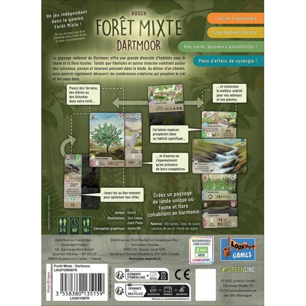 Avec ses 180 cartes finement illustrées, son matériel sans plastique et ses règles accessibles, Forêt Mixte : Dartmoor séduit les familles comme les amateurs de nature et de réflexion. Il s’agit d’un jeu indépendant de la gamme Forêt Mixte, idéal pour découvrir ou prolonger l’expérience.