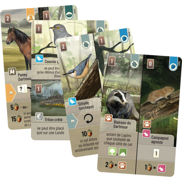 Chaque carte est une pièce du puzzle vivant que vous allez composer : certains animaux ont besoin d’un type de terrain spécifique (lande, rivière…), d’autres préfèrent être seuls ou entourés de leurs congénères. Mettez en place des synergies à effet immédiat ou persistant, profitez des bonus conditionnels et de la gestion de la clairière commune. Les cartes divisées en deux permettent un large éventail de choix.