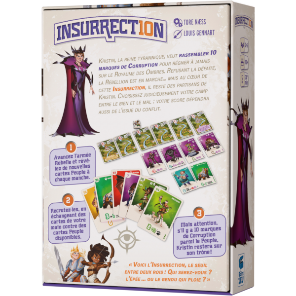 Dans Insurrection, vous incarnez un(e) Chef(fe) Rebel(le) qui se révolte contre la tyrannique Reine Kristin. Sur le Chemin menant à la Forteresse de Kristin, vous allez recruter des troupes afin de composer la meilleure armée possible (meilleure main de cartes). Mais la terrible Reine a disséminé des marques de Corruption au sein de la population. Si l'Insurrection parvient jusqu'au noir château de Kristin, le Bien l'emporte. Toutefois, si 10 marques de Corruptions se retrouvent simultanément au sein du peuple présent dans la partie, c'est le Mal qui l'emporte.