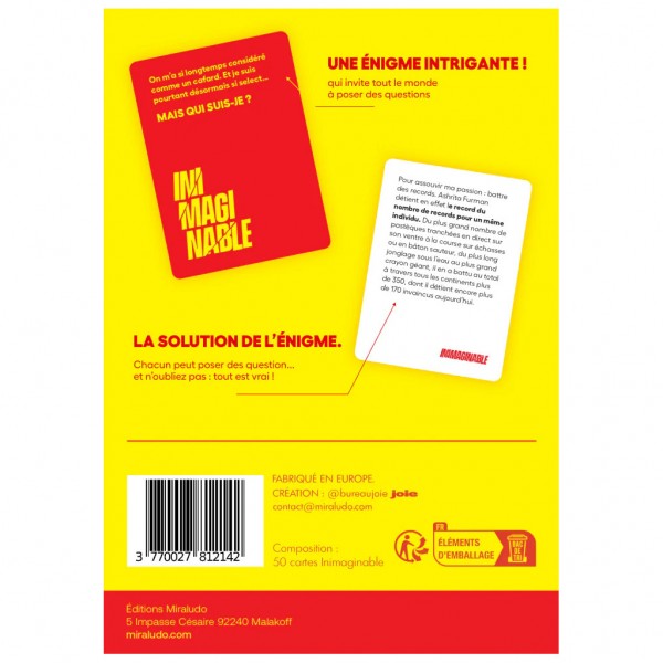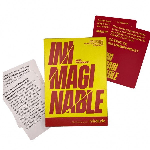 Dans Inimaginable, explorez des faits incroyables mais pourtant réels ! Chaque carte présente une énigme surprenante, et les joueurs doivent poser des questions fermées (oui/non) pour en découvrir l’explication.