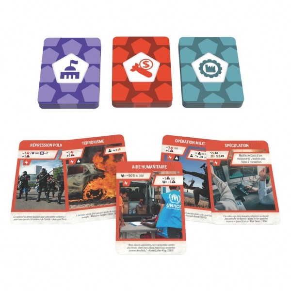 1) La phase Politique où vous prenez des décisions politiques. Piochez et jouez des cartes par paires en appliquant leurs effets : améliorer le niveau de vie de sa population, construire des usines, promouvoir le végétarisme, attaquer une Nation, avoir une production délocalisée, etc.