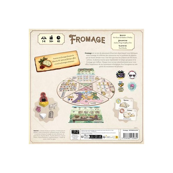Devenez le fromager le plus en vue, dans ce jeu de placement d’ouvriers ! Jouez simultanément, développez votre stratégie (préférerez-vous les foires aux vitrines alléchantes ? Les pâtes cuites aux pâtes crues ?) et votre production dans le même temps… Car Fromage se joue simultanément, grâce à un plateau tournant.