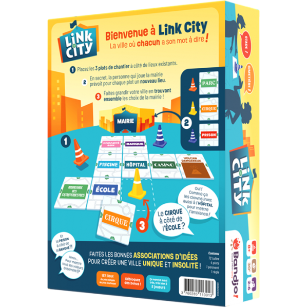 Link City se joue en 6 tours. À chaque tour, une personne différente joue le rôle de la mairie. Sa mission : agrandir la ville ! Mais... Ferez-vous les mêmes associations d'idée que la mairie ? Seule l’harmonie vous permettra de connecter un maximum de lieux pour réussir une ville unique et insolite !