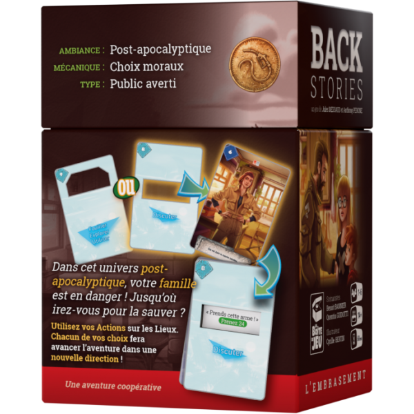 Backstories est un jeu d’aventure coopératif qui fonctionne à la manière d’un « point & click ». Choisissez une action (Fouiller, Discuter, Explorer, etc.) sur un lieu et révélez les conséquences de votre choix grâce à un astucieux système de cartes perforées. Plusieurs fins sont possibles !