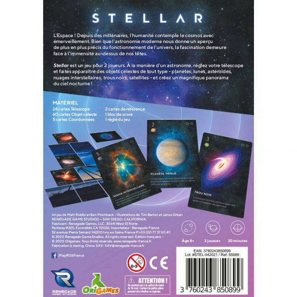 Durant 11 manches, votre télescope ET votre carnet se remplissent de vos observations. Vous et votre adversaire jouez 2 cartes corps célestes par tour. Le choix de la première carte jouée contraint la pose de la deuxième. À tel tour, compléterez-vous d’abord votre carnet OU votre télescope? Les corps célestes joués dans votre télescope doivent être adjacents ; ils rapportent des points de majorité en fonction de la zone où ils se trouvent en fin de partie. Leur pouvoir se multiplie à votre série de collection dans votre carnet, mais uniquement pour le même type de corps célestes. Les doublons ne comptent pas dans votre carnet, mais permettent d’étoffer la majorité dans votre télescope. Observer les étoiles sans observer le jeu de votre adversaire pourrait vous coûter la victoire...