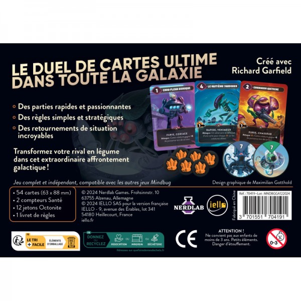 Mindbug : Bataille de Fruits Galactique est un jeu standalone dans l’univers Mindbug où Objet Fruité Non Identifié et Oignons Cyborgs vont se faire face. Et comme toujours, même s’il est un standalone, Mindbug : Bataille de Fruits Galactique peut être joué de manière indépendante ou associé avec d’autres jeux Mindbug.