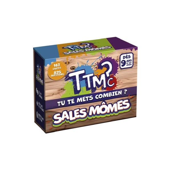 TTMC Sales Mômes, c'est la variante du jeu d'ambiance TTMC - Tu Te Mets Combien ? destinée aux 9-13 ans, dans laquelle ils vont auto-évaluer leurs connaissances de 1 à 5 sur une multitude de sujets adaptés à leur âge. Le but est d’être le premier à parcourir le plateau en répondant aux questions posées. À chaque note correspond une question, plus ou moins complexe : plus la note choisie est élevée, plus la question est pointue. En cas de bonne réponse, l'équipe avancera du nombre de cases correspondant à sa note auto-évaluée. Par exemple si tu réponds juste à une question 3, tu avanceras de 3 cases.