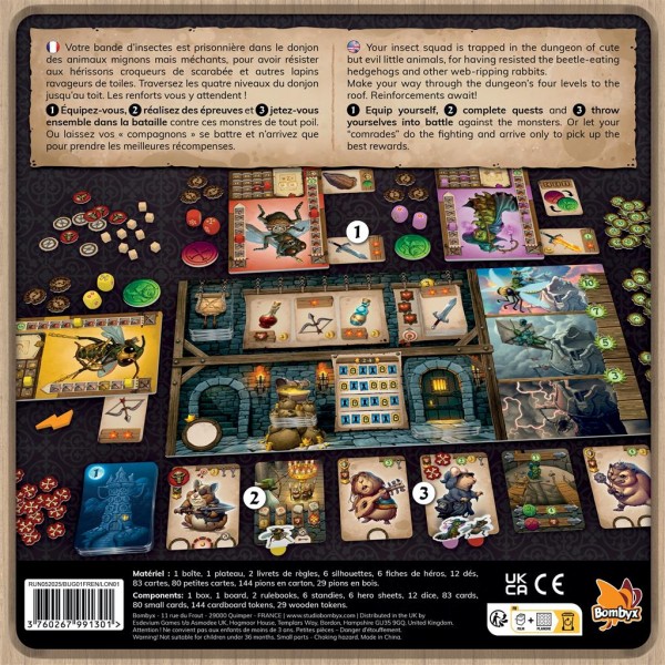 Votre bande d'insectes est prisonnière d'un donjon, enfermée par des animaux habituellement mignons mais ici très méchants : hérissons croqueurs de scarabée et autres lapins ravageurs de toiles. Ensemble, traversez les 4 niveaux du donjon jusqu'au toit