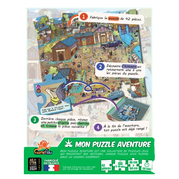 « Mon Puzzle Aventure » est le renouveau d'un classique : le puzzle. Réalise le puzzle puis, une fois les 42 pièces placées, retire-les dans l'ordre et découvre l'histoire en les retournant. Chaque nouvelle pièce donne l'indice pour trouver la suivante.